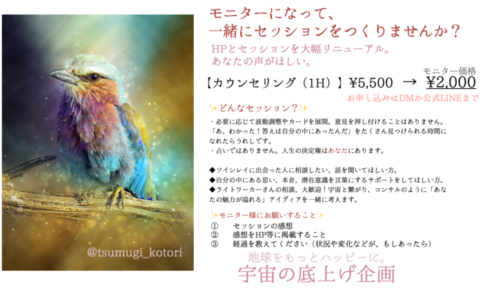 ・ツインレイもしくはツインレイと思う人に出会った、話を聞いてほしい。 ・自分がどうしたいのか、またはどうしたらいいのか、わからない。自分の本音を確かめたい。 ・ライトワーカーさんのコンサル。あなたの「光のお仕事」、一緒に形にしましょう!